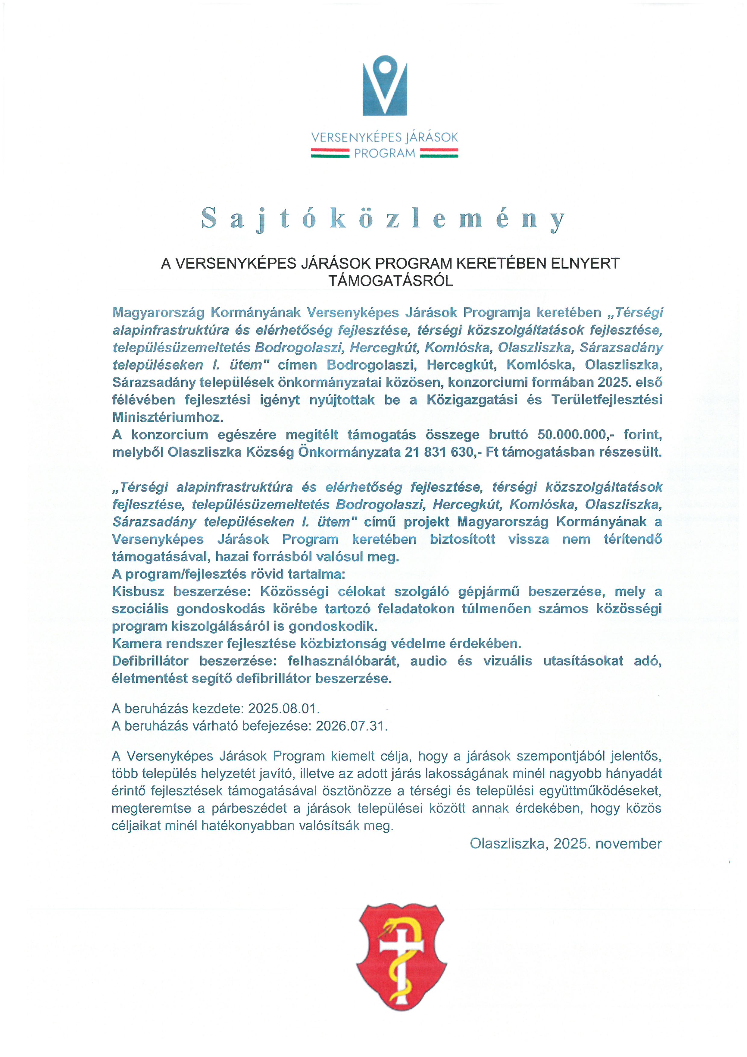 „Térségi alapinfrastruktúra és elérhetőség fejlesztése, térségi közszolgáltatások fejlesztése, településüzemeltetés Bodrogolaszi, Hercegkút, Komlóska, Olaszliszka, Sárazsadány településeken I. ütem"